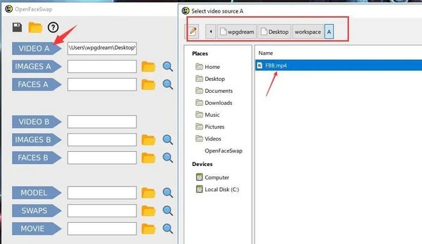 点击 VIDEO A 跳出一个串口,选择自己的workspace目录,选中A文件夹中的FBB.mp4