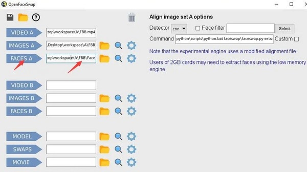 点击 FACES A 后面黄色文件夹,选中Face目录,然后点击FACES A 开始从图片中提取人脸。