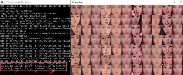 上面红色框中的数字是一个训练指标,Loss_A,Loss_B后面的数字越小越好,一般来说当数值小到0.02 或者0.0.1就差不多了,当然你也可以直接看预览图的效果,如果人脸非常清晰了,这个环节就结束了。
