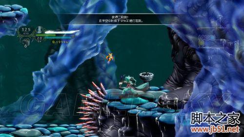 本地图刚开始取得一个关键技能——2段跳,取得2段跳之后就可以穿过本关路上碰到的障碍了。本地图中出现的敌人经验值普遍很高,雪狼等经验值都在600左右,值得注意的新敌人是在空中飘着的女妖,血厚只会施法魔法,利用她施法时间过长的特点一直浮空攻击她即可,让她一个技能都放不出来。